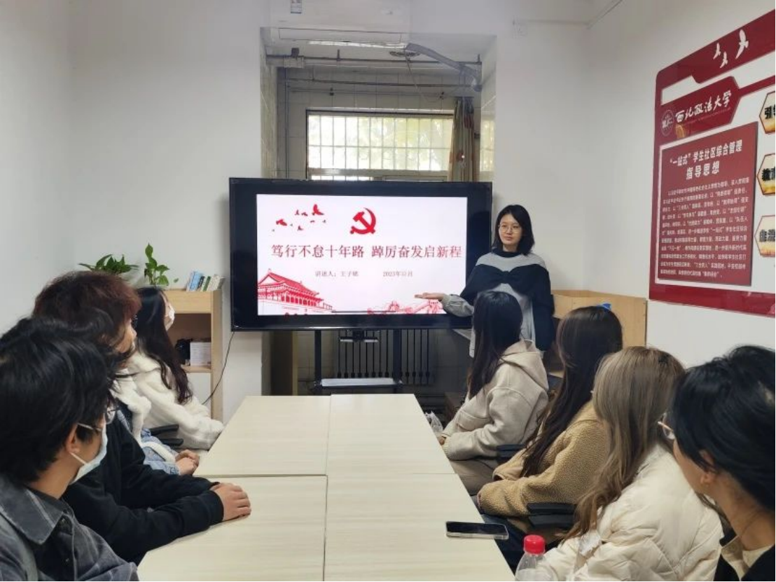 为深入学习宣传贯彻党的二十大精神,深刻领悟高质量发展内涵要义,12月1日,性爱直播 学生第一党支部在学生公寓2号楼思政工作站开展“笃行不怠十年路,踔厉奋发启新程”新时代十年伟大变革宣讲活动。