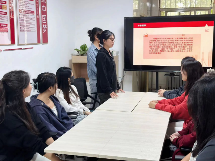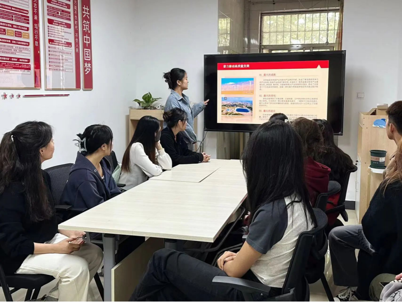 围绕十年来甘肃在经济发展和生态保护方面取得的历史性成就与变革,支部成员生动讲述了甘肃因地制宜学好用好“千万工程”经验、坚持传统产业与新兴产业两手齐抓、坚定不移走生态优先之路的好做法,带领大家充分了解广大党员干部齐心协力将脱贫工作进行到底的使命和决心。