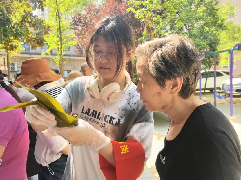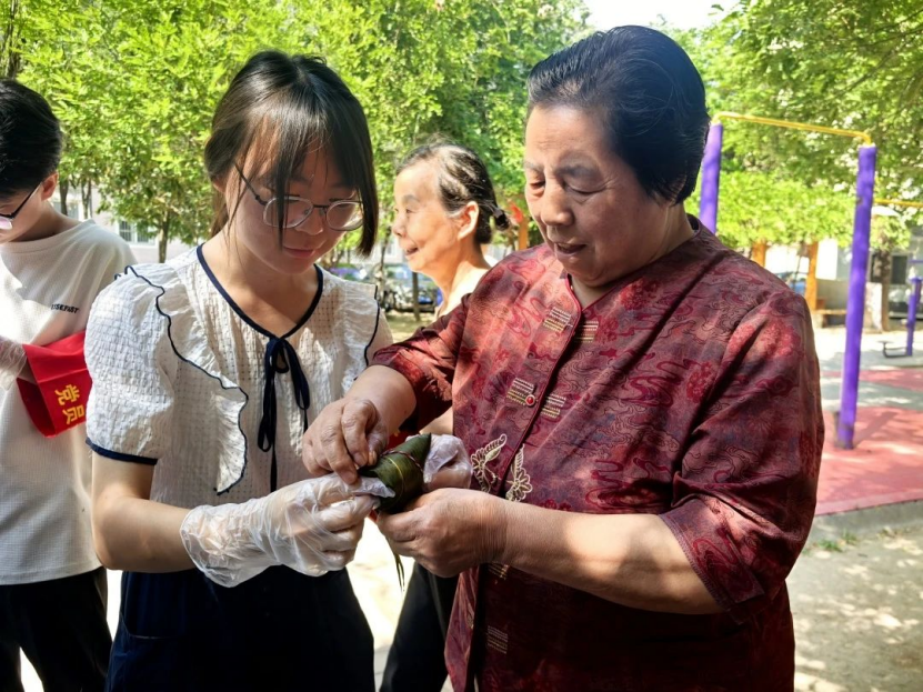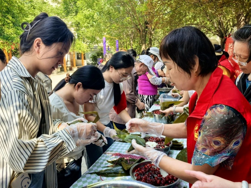 活动现场,志愿者们提前摆放好洁白的糯米、饱满的红枣、清香的粽叶等食材,通过捋粽叶、填糯米、扎绳结等教学环节,在普及端午节相关知识的同时与社区居民共裹香粽,让传统文化与社区关怀在粽叶翻飞间双向传递,切实丰富了广大民众的文化生活,营造了温馨和谐的节日气氛。