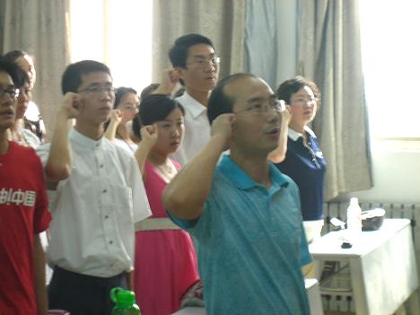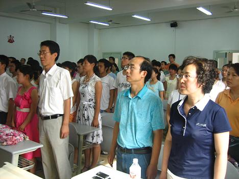 仪式在雄壮的《国际歌》乐曲中正式开始。紧接着,此次入党的全体新党员在刘光勇老师的带领下,面对神圣的党旗,光荣地举起右手进行宣誓,大家声音宏亮有力,场面热烈令人激奋。之后,由06级新党员马帅同学代表此次入党的全体党员同学发言,他从思想、学习、工作、生活等各方面向大家阐明了学生党员应当发挥的积极模范带头作用,并表达了学生党员热爱党、要求进步,并力求在今后的学习生活中不断使自己成长,从而成为一个先进的共产党员的坚定决心。接着,李燕老师对在场的学生党员发表了热情洋溢的讲话,她就现今学生党员所面临的实际问题,向大家作了深入浅出的分析,并结合当代大学生的特点谈了几点自己的希望,她指出:学生党员一定要端正自己的入党动机和态度,做到真正愿意向党组织靠拢,并且在各个方面都要充分地体现党员的先进性作用和模范带头作用,从而不愧于学生党员这样一个光荣的称号。最后,她还结合当下党内腐败问题,对全体新党员同学提出了中肯建议,要求大家正确对待、客观分析,并希望大家抵御诱惑,坚持原则,做一个真正合格的中国共产党员。