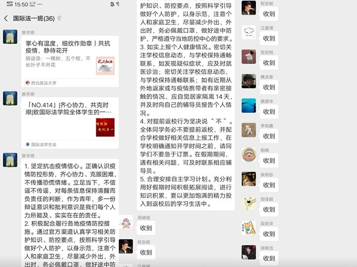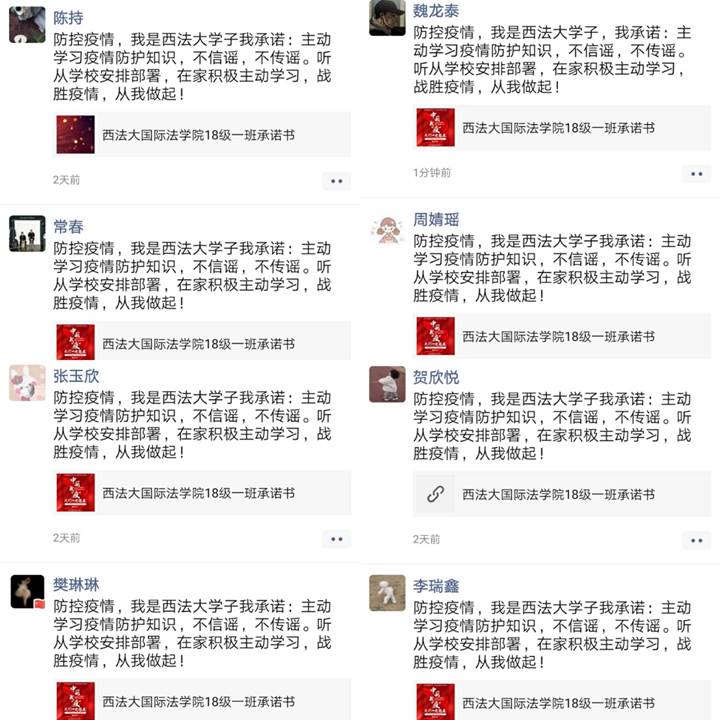 2月11日,2018级一班积极响应,开展“防控疫情,我是西法大学子我承诺”网上承诺活动。同学们踊跃参与本次活动,并以实际行动做出承诺,在居家隔离的同时,更不忘记做一名学习的“修行者”。李景轩、张玉欣等同学以坚持每日英语单词打卡、每日读书笔记、预习专业课等行动,做到了不忘党员先锋意识,积极提升自我,充实假期。