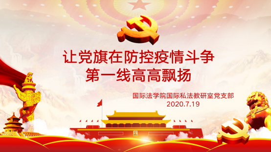 为贯彻落实党中央关于常态化疫情防控的决策部署,在疫情防控、返校复学、教学工作中全过程、全方位地发挥基层党组织战斗堡垒作用和师生党员先锋模范作用,7月19日上午,性爱直播 国际私法教研室党支部开展“让党旗在防控疫情斗争第一线高高飘扬”主题党日活动。支部全体党员参加活动,支部书记张望平主持活动。