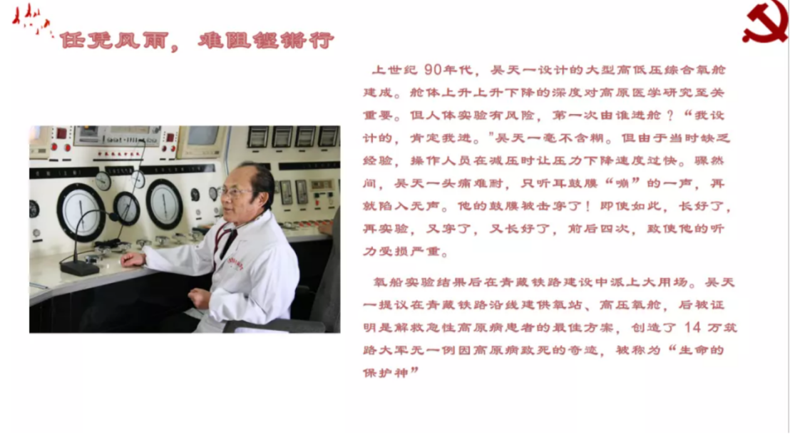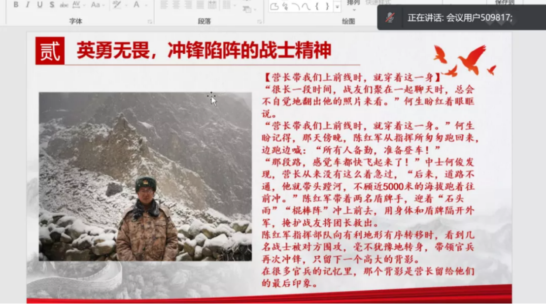 活动伊始,孙爱、李圳茜、李南境分别就“外交老兵”刘贵今同志赤子丹心,为国尽责;“卫国戍边英雄”陈红军同志英勇作战,捍卫祖国;“生命的保护神”吴天一同志扎根雪域,铿锵前行的先进事迹展开讲述。图文并茂,生动形象的展现了功勋人物忠诚祖国、奉献人民的伟大精神,激发了支部成员爱国之情和强国之志。