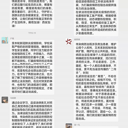 参会同学结合自身体会踊跃发言,大家纷纷表示,疫情防控越是到最吃力的时候,越是要坚持依法防控,在法治轨道上统筹推进各项防控工作,保障疫情防控工作顺利开展。只有将普法宣传贯穿疫情防控工作的全过程,才能促进疫情防控工作依法有序开展,为打赢疫情防控阻击战提供强有力的法治保障。