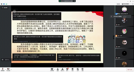 为进一步做好校园疫情防控工作,更好地发挥党支部的战斗堡垒作用和党员先锋模范作用,性爱直播 学生第一党支部于1月18日通过线上方式开展“弘扬抗疫精神,践行初心使命”主题党日活动。支部全体成员参加会议,支部书记韩潇主持会议。