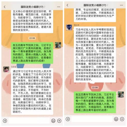 习近平总书记对新时代青年的深情寄语和殷切期望,体现了党中央对青年的关怀和对青年工作的重视,为广大青年在实现民族复兴的时代洪流中充分发挥先锋作用指明了前进方向,提供了根本遵循。大家一致表示,习近平总书记的讲话让自己对新时代青年的历史责任的认识更加深刻。身为学生党员,学习好、研究好、宣传好党的创新理论成果,是新一代青年的重大责任。未来,要坚定信仰,不断精进理论知识,提升专业素养,让党的理论随青年的步伐走出校园、走进基层、走向社会、走遍世界。同时,更要勇担时代责任,展现青年担当,把对祖国血浓于水、与人民同呼吸共命运的情感贯穿学业全过程、融入对公平正义法治事业的追求中。