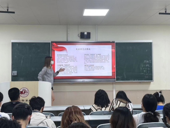 团支书由民法典三问入手,介绍了民法典的基本情况和各编的基本内容。以案释“典”的形式,以生动的案例、鲜活的语言向同学们讲述民法典故事、阐释民法典精神,并组织同学们观看民法典宣传片,引导大家做遵纪守法的青年。