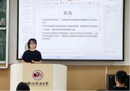 王方予学姐依据自身经验,围绕“调剂”的基本条件、填报技巧、申请流程等内容进行详细介绍,提醒同学们要仔细了解目标院校的调剂规则,提前做好规划,确定未来学习方向。