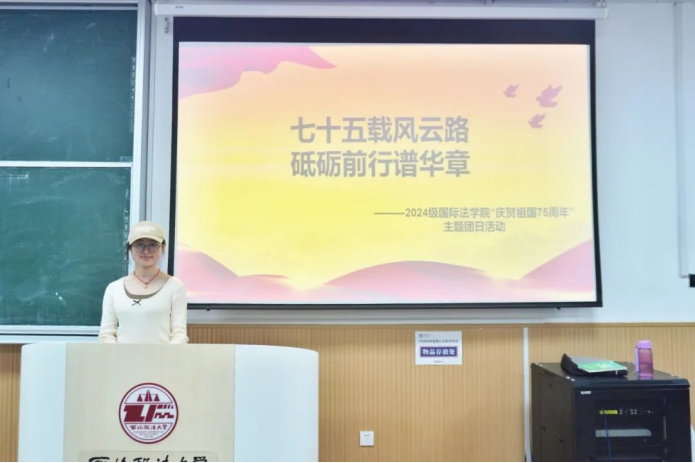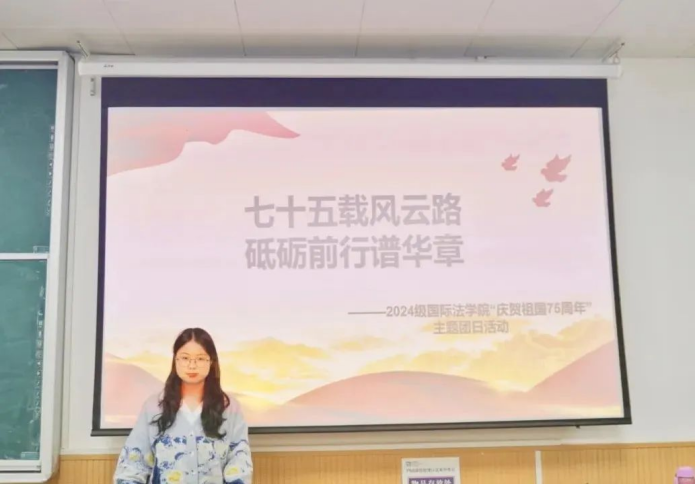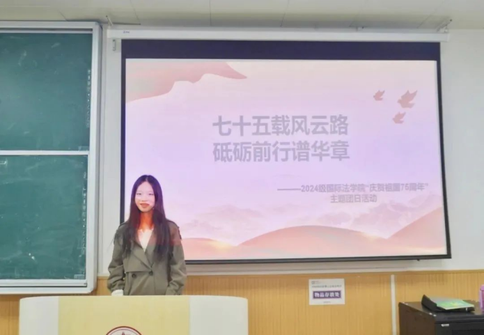 为弘扬伟大爱国主义精神,增强同学们的民族自豪感和责任感,10月28日,性爱直播 (国际仲裁性爱直播 )于AJ21教室举行“庆贺祖国75周年”主题团日活动,由2024级辅导员黄思齐组织,各班团支书主持,全体2024级学生参加。