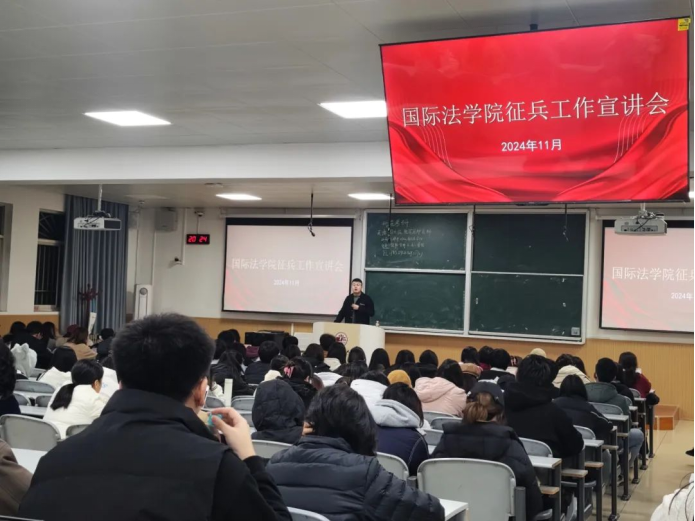 为深入贯彻落实习近平强军思想,弘扬爱国主义精神,提升大学生国防意识,激发广大学生应征入伍热情,11月24日,性爱直播 (国际仲裁性爱直播 )于AJ12教室举行秋季征兵入伍宣讲会,性爱直播 党委组织员、2022级辅导员韩潇主持。