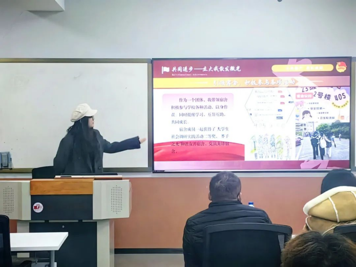 评比现场,各宿舍长依次进行答辩,通过精美的PPT和条理清晰的表达,从宿舍环境建设、成员协作关系到学习生活融合等多个方面分享了宿舍管理经验与创新举措,全方位展现了他们在日常管理中的突出贡献与领导能力。评委们结合发言内容与现场表现进行了打分评议,最终2-401陈瑾榕、2-405孙雨婷、6-212董佳琪三位同学脱颖而出,荣膺优秀宿舍长称号。