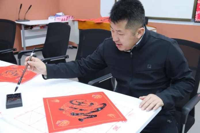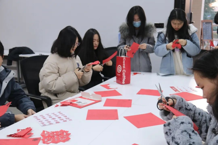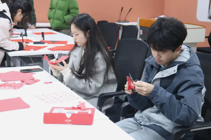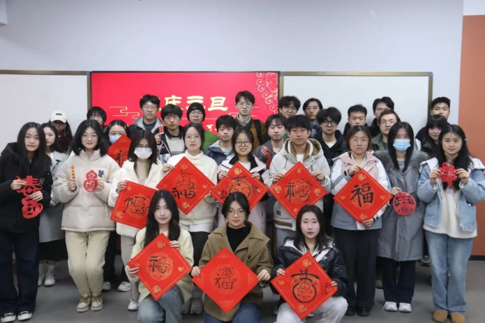 活动现场热闹非凡,节日气氛浓厚。在猜灯谜环节中,同学们或专心思考,或热烈讨论,每当谜底揭晓,欢呼声和笑声顿时响起,为现场增添不少欢乐。在剪纸环节中,同学们手持剪刀,巧手翻飞,剪出精美的窗花和“福”字,既展现了传统技艺的魅力,也寄托了对新年的美好期待。在书写“福”字环节中,徐秉鹏与同学们一起挥毫笔墨,一笔一划都承载着对新年的祝福,现场洋溢着喜庆与温暖。