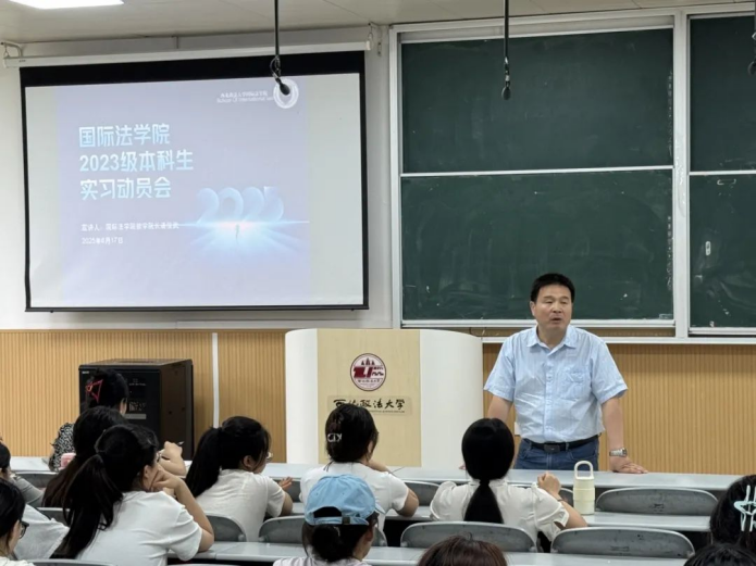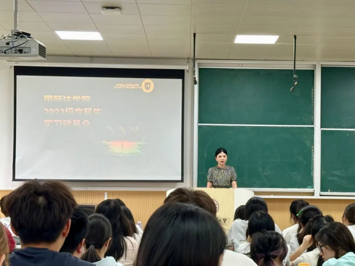 动员大会由辅导员苏芝双主持。潘俊武副院长在开场致辞中,从专业发展与职业成长的双重维度,深刻阐述了实习实践的战略意义,他鼓励同学们以高度的热情投入集中实习,主动将课堂所学的国际法律理论与实务场景紧密结合,在实践中锤炼专业素养。随后,教务秘书张毓慧对实习工作进行了全方位解读,围绕时间规划、岗位分配、过程管理、考核标准等核心环节展开细致说明,系统介绍了本年度20家合作实习基地的特色优势与资源禀赋,确保每位同学明晰实习流程与规范要求。最后,吴晓娟副书记着重强调实习纪律与安全管理,要求同学们严格执行实习日志制度,强化自我保护意识,严守实习单位规章制度,并建立常态化沟通机制,定期向指导教师汇报实习进展。