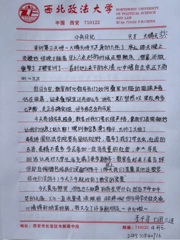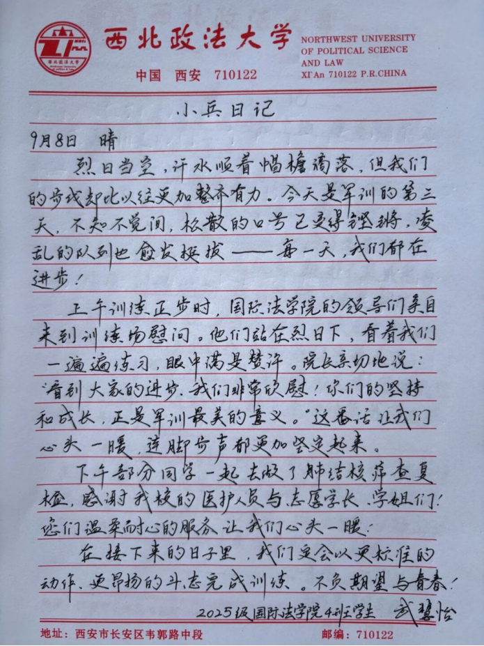 军训场上的号角、训练场的汗水、休息时的笑声,都藏进了一本本小兵日记里。从青涩到坚毅,从散漫到严整,他们在训练场上挥洒汗水,在口令声中淬炼意志。一段关于成长、责任与担当的青春记忆,正在脚步与呐喊中悄然书写。这是属于小兵们的日记,也是他们迈向成熟的第一道军令。