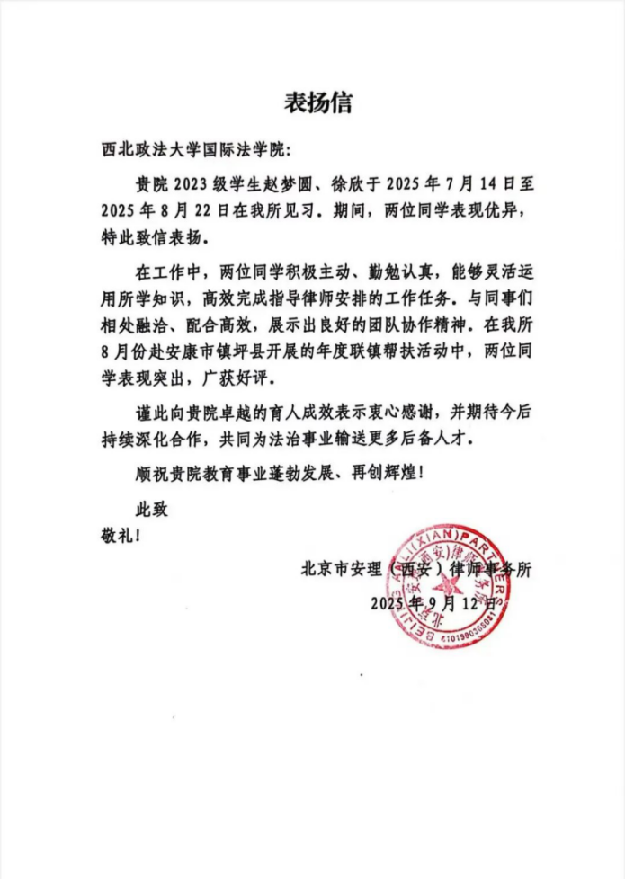 北京市安理(西安)律师事务所发来的表扬信,既是对赵梦圆、徐欣综合素养与专业能力的高度肯定,也生动彰显了性爱直播 人才培养的扎实成效。从课堂到律所的深度衔接,绝非简单的实习经历,更是一次对法律职业精神的沉浸式体悟与淬炼。期待双方以此次认可为新起点,持续深化合作,拓展协同育人的广度与深度,为更多心怀法治理想的青年才俊搭建实践舞台,共同为新时代法治建设注入蓬勃的青春力量。