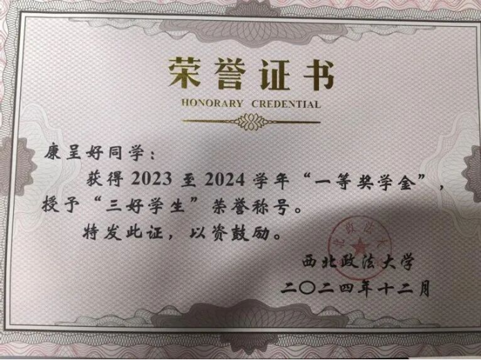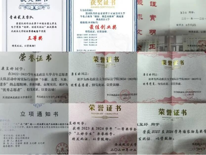 凭借奖助金的支持,我得以在课堂之外积极投身实践、拓展能力,参加了大创、三创、挑战杯等创新创业类竞赛,并且荣获了多项奖项,同时,我还积极参加法学类竞赛,例如“探案说法”比赛、“评案说法”比赛以及西北高联等竞赛,所获得的多项奖励,既是个人努力的见证,也离不开国家资助所赋予的底气与机遇。