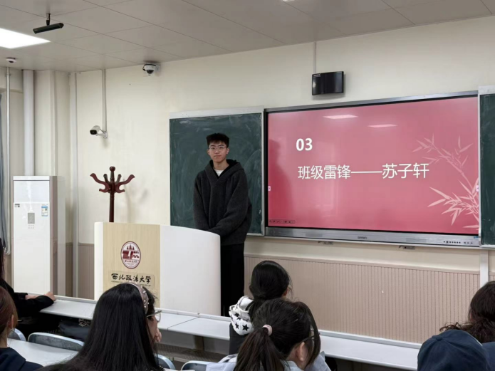 班级“学雷锋榜样”苏子轩同学分享了自己践行雷锋精神的亲身经历。真实的故事、朴素的行动,让同学们深受触动和启发。大家深刻体会到,雷锋精神从不是高高在上的道德标杆,而是蕴藏在日常善举中的真诚与担当。身边的榜样用朴素而坚定的行动,生动诠释了奉献、责任与担当的时代内涵。原来,崇高精神并不遥远——当它被身边的朴素行动诠释,信仰便有了温度,价值便有了锚点。