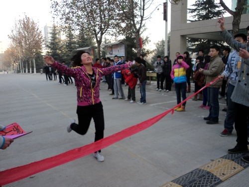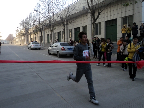 南校区部道路为赛道,事先划定线路的长跑比赛。比赛线路沿线设有监督点以防突发情况。比赛成绩按所用时间长短来确定名次。越野赛的第一名的同学冲过终点时,引来大家的阵阵欢呼,最后坚持跑完全程的同学虽然未能名列前茅,但也获得了同学们鼓励的掌声。在当天的比赛中有位参加越野赛的女同学突然感到身体不适,乔军伟老师亲自开车将那位同学送到校医务室,并安排了治疗的相关事宜。