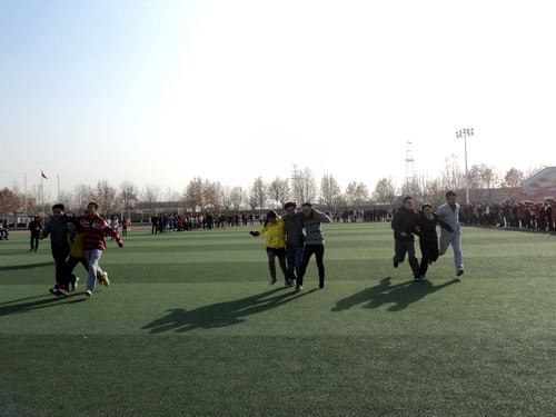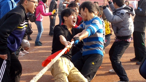 越野赛过后是拔河比赛,大一大二14个班级以班级为单位组成的14支队伍参加比赛,第一轮比赛产生7支队伍进入第二轮比赛,这7支队伍重新抽签确定自己的对手并确定一支轮空的队伍。通过第二轮比赛最后确定进入决赛的四支队伍。四支队伍再抽签决定对手,进行第三轮比赛,第三轮比赛胜出的两支队伍争夺冠军,未取胜的队伍争夺第三名。每轮比赛实行三局两胜制,取前四名进行奖励。比赛中,同学们不顾天气的寒冷,在比赛中团结一致,劲往一处使。秦音老师和苏芝双老师也来到比赛场上为同学们加油,同学们士气大振,运动场上不停传来阵阵加油呐喊声,比赛精彩激烈。最后2012级七班获得第一名,2011级一班获得第二名。获胜的班级欢呼雀跃,大家在一起拥抱、互相击掌分享胜利的喜悦。