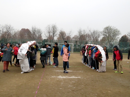 下午2点,进行拔河和趣味组合接力两个项目。首先进行的是拔河比赛,共有十支队伍参赛,两两对决。比赛实行三局两胜制,对前四名班级进行奖励。大家发挥团队意识,共拉一根绳,心往一处靠,力往一处使。选手们拼劲全力,场下的拉拉队也为自己的班级呐喊助威,比赛气氛十分热烈。经过激烈角逐,2014级一班夺冠,2013级二班和2014级五班分别获得第二名和第三名。随后进行趣味组合接力,由扔乒乓球、猛龙过江、障碍背人、风火轮四个项目组合而成,接力赛中大家相互配合默契,团结一心。尽管天气寒冷,但同学们乐在其中。最后,2013级一班、2014级四班、2014级二班分别获得前三名。