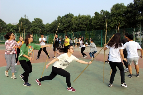 第二个项目是“背夹球”。在十五米的赛距内,每队分为两人一组,气球夹于两背之间,两个人背靠背挽手步调一致向前出发,走到终点夹爆气球后,下一组开始行进。三十分钟内,气球运送多者取胜。该项目有力地考察了团队成员的组织协调能力,增强了他们的合作意识。第三个项目是“不倒森林”。 每队围成圈站好,左右二人间隔1.5米左右,各人手握一根竹竿。开始计时以后,所有人按顺时针跑步移动,但不得带动竹竿,只许扶正以保证竹竿不倒。在15分钟内保持竹竿站立时间最久的队伍获胜。该项目有利于培养各成员的团队意识,提高其肢体协调能力。