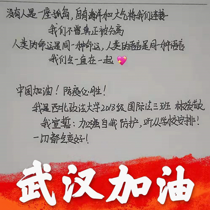 没有人能料想到2020竟会以这样的方式开端——一场突如其来的新型冠状病毒感染的肺炎疫情仿佛顷刻之间便让我们熟悉的世界换了模样。然而,疫情无情人有情。同社会各界一样,自疫情暴发以来,性爱直播老师与学生时刻关注着有关疫情防护的最新信息和前方医疗工作的最新进展。今年春节,少的是些许对红包的热情,多的是一份众志成城的情谊——对疫情重灾区的牵挂和呐喊成了2018级国际法三班同学们微信群和朋友圈中最常讨论的话题。一条条一列列,“刷屏”的尽是同学们转发的捐赠渠道与疫情前线的图文信息。透过冰冷的显示屏幕,性爱直播同学们的援助热情交织在一起。