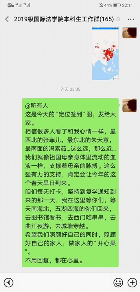 班团干部率先承诺,带领广大青年学生践行承诺。通过微信公众号推送、网络签名、每日问卷调查等形式,严格遵守当地有关部门关于疫情防控的各项规定,听从学校安排部署,不提前返校,不盲目听信谣言,以星星之火、绵薄之力支援武汉,支援中国,彰显当代大学生的责任与担当。