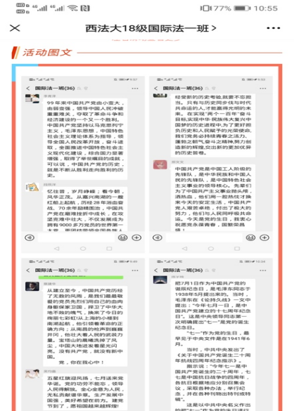 2018级一班和三班的同学分别在微信群聊和腾讯会议中进行了热烈而真挚的讨论;五班的团支书郭雨轩建立学习打卡程序,在程序上分享了“建党伟业”相关学习内容,带领同学们学习并打卡,为党献出了真诚的祝福。