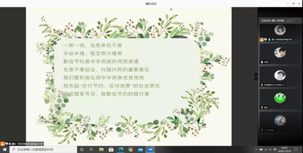 19级二班团支书王子玥带领同学们学习了中央关于“厉行节约”的各项规定,并展示了毛泽东主席、周恩来总理、伊丽莎白二世等国内外名人厉行节约的优秀事迹,号召大家通过行动来践行节约理念。三班团支书秦紫雯则带领大家学习了校党委学工部致性爱直播 全体同学的倡议书,引导同学们珍惜劳动者的辛苦付出和艰辛劳作,建立正确的劳动观和奋斗观。