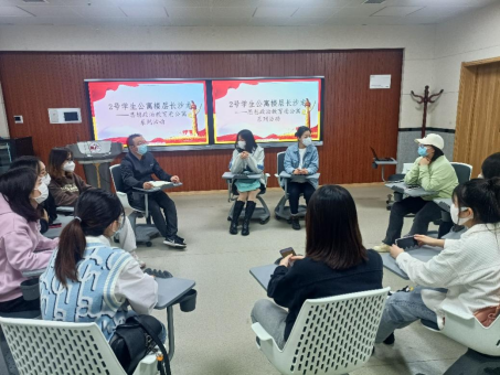 2022年4月14日下午,2号学生公寓楼层长沙龙在5号楼403教室举行。沙龙围绕着思想政治教育进公寓工作如何开展的主题顺利进行。2号学生公寓各层楼层长和学生宿舍代表参与沙龙,2019级辅导员苏芝双老师主持沙龙。