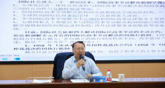 王瀚以已经生效的1958年《承认和执行外国仲裁裁决公约》、2015年海牙国际私法会议《选择法院协议公约》、2018年《联合国经调解所产生的国际和解协议公约》和将于今年9月1日生效的海牙国际私法会议《承认和执行外国民商事判决公约》为主线,就仲裁、诉讼和商事调解三位一体的国际商事争议跨国执行机制的形成和演进、国际商事争议解决机制与国际经济秩序的内在互动规律、国际商事争议解决机制的发展动向以及中国国际商事争端解决机制构建等问题做了分享,并与学生进行了互动交流。