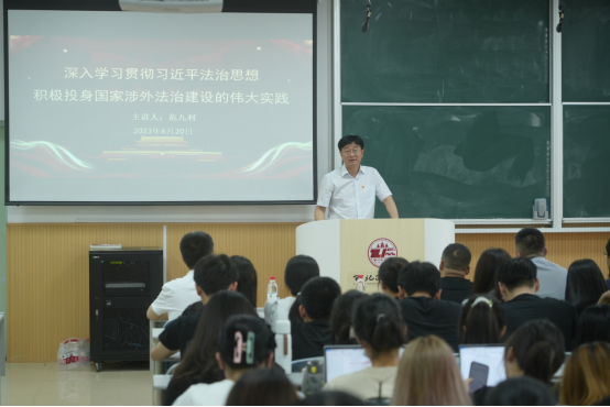 范九利围绕“深入学习贯彻习近平法治思想,深刻认识‘三个前所未有’”“正确认识国家涉外法治建设面临的形势和任务”“积极投身国家涉外法治建设的伟大实践”三个方面作了论述。