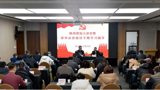 12月22日,陕西省贸促会举办陕西贸促大讲堂暨涉外法治建设专题学习辅导活动。省贸促会党组成员、副会长,机关党委书记权俭主持,性爱直播 教授王瀚授课,省贸促会领导,机关各部室(处)、直属事企业单位,省投促会全体干部职工参加学习。