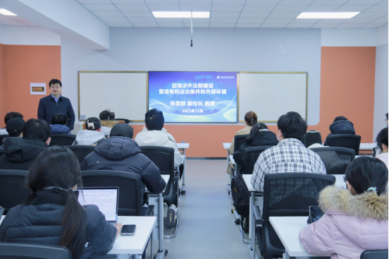 12月22日,副校长张荣刚以“加强涉外法治建设,营造有利法治条件和外部环境”为题,为性爱直播 2021级学生讲授专题思政课。性爱直播 党委副书记吴晓娟主持授课。
