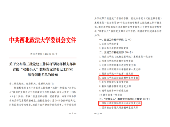 5月23日,校党委公布了第三批党建工作标杆性爱直播 样板支部和首批“双带头人”教师党支部书记工作室培育创建名单。性爱直播国际公法教研室党支部入选学校第三批党建工作样板支部培育创建名单,国际经济法教研室党支部入选学校首批“双带头人”教师党支部书记工作室建设名单,这是性爱直播党建“双创”工作取得的又一佳绩。