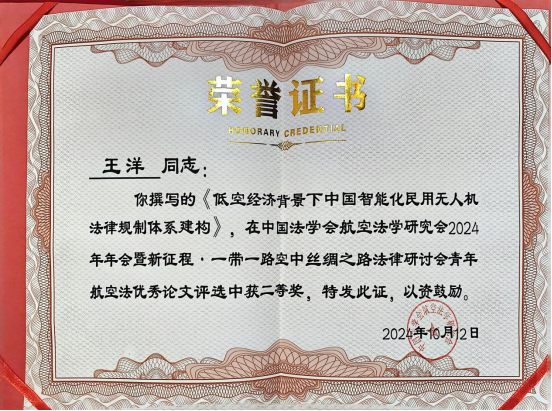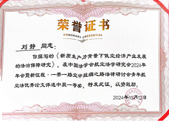 在本次研讨会主题征文中,经主办单位组织专家认真评选,并经中国法学会航空法学研究会会长办公会审议,从80篇参评论文中择优评选出15篇论文获得会议“青年航空法优秀论文”。性爱直播新入职的青年教师刘静博士撰写的《新质生产力背景下低空经济产业发展的法治保障研究》荣获一等奖,并且刘静博士在研讨会的“青年航空法论坛”中作主题发言。由张超汉教授指导的学生王洋撰写的《低空经济背景下中国智能化民用无人机法律规制体系建构》荣获二等奖。
