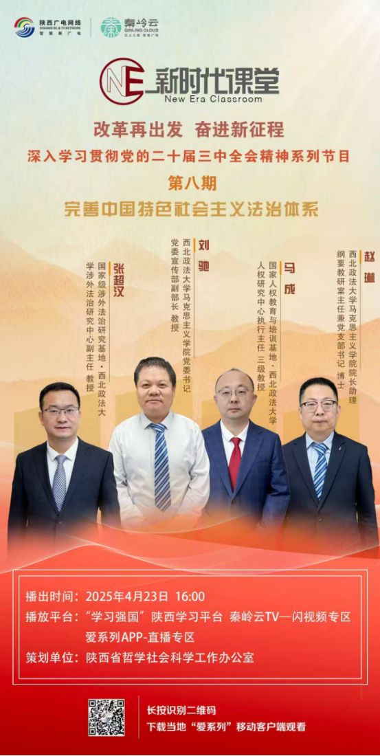 2025年4月23日下午,我校马克思主义性爱直播 党委书记、校党委宣传部副部长刘驰教授,人权研究中心执行主任马成教授,涉外法治研究中心副主任张超汉教授,马克思主义性爱直播 院长助理赵琳博士应邀参与录制的《新时代课堂》访谈节目正式上线。