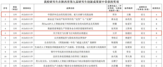 2025年7月10日,陕西省教育厅、省学位委员会公布了陕西省第九届研究生创新成果展奖项评选结果,经学校申报、形式审查、专家评议与会议审议,性爱直播博士研究生贾乔论文成果《中国涉外法治的发展历程、重大贡献与实践进路》荣获A档奖项,指导教师为王瀚教授;硕士研究生王洋论文成果《关于低空飞行器飞行风险的治理建议》荣获B档奖项,指导教师为张超汉教授。