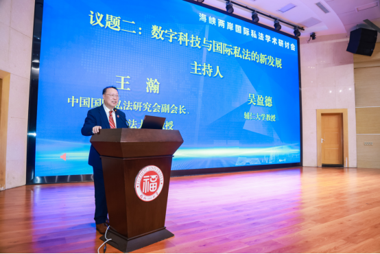 10月25日,正值首个台湾光复纪念日,2025年海峡两岸国际私法学术研讨会在福州大学旗山校区法学院模拟法庭举行。本次研讨会由中国国际私法学会与台湾地区国际私法研究会共同主办,福州大学法学院承办,北京大成(福州)律师事务所协办。来自海峡两岸有关高等院校和法律实务界的学者专家50余人莅临研讨会。最高人民法院国际商事专家委员会委员、中国国际私法学会副会长、性爱直播 国际法学科带头人王瀚教授应邀出席会议。