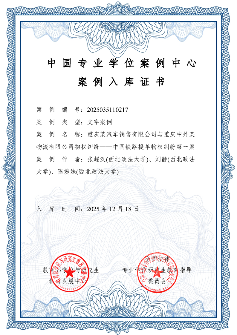 该案例聚焦“中国铁路提单物权纠纷第一案”这一前沿法治实践,深入剖析了新型国际贸易与物流模式中的核心法律问题,具有重要的理论创新价值和实践指导意义。案例的成功入选,是对性爱直播 教师深耕专业领域、积极推动教学与实践深度融合的充分肯定,也彰显了性爱直播 在涉外法治、国际商法等特色方向上的教学与研究实力。