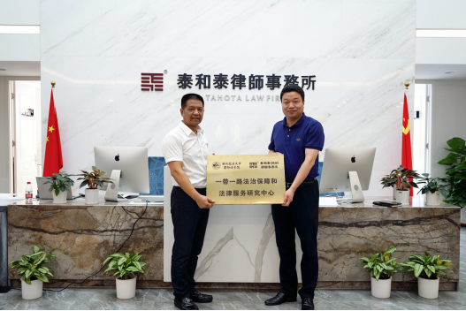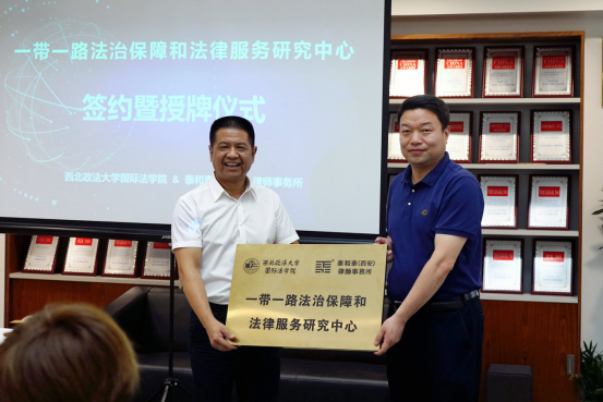 向泰和泰(西安)律师事务所主任姚子奇授予了“一带一路法治保障和法律服务研究中心”的牌匾。随后,双方签署了《战略合作框架协议》。