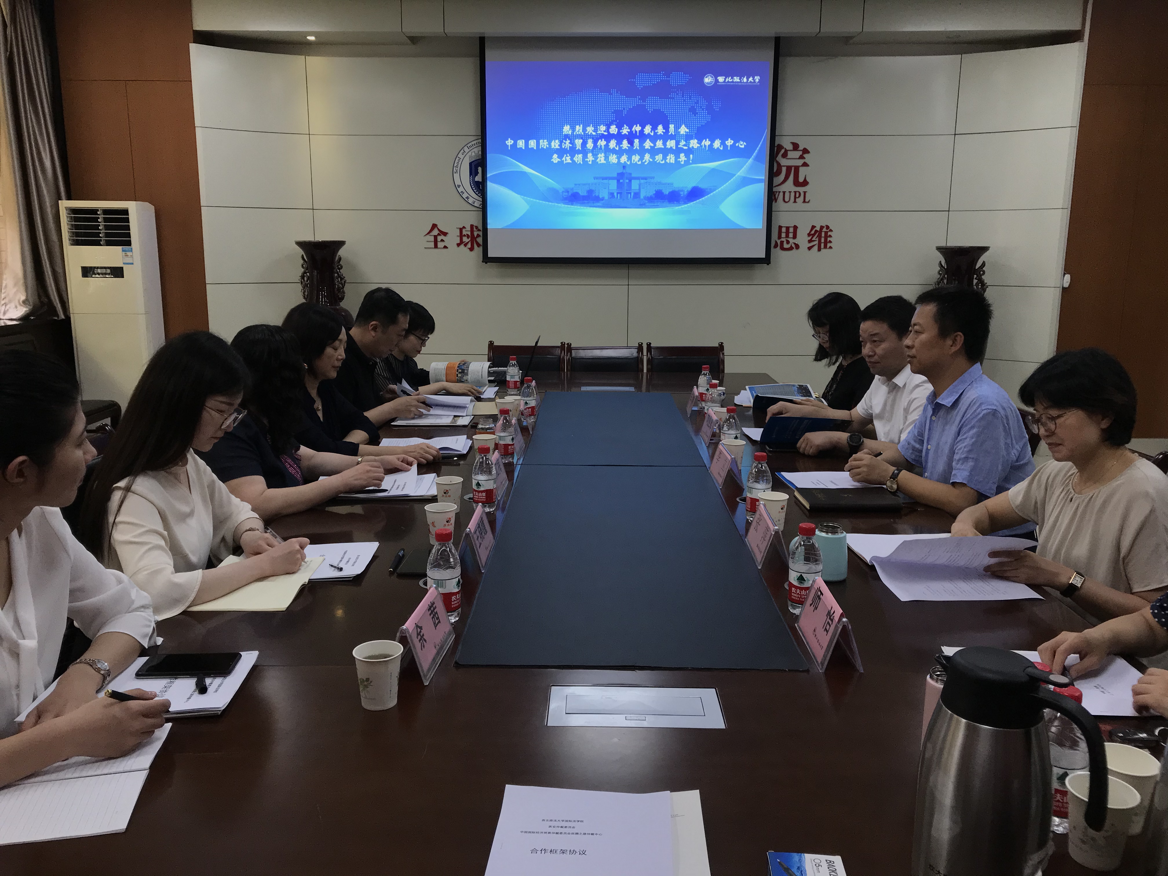 出席会议的嘉宾有西安仲裁委员会负责人白晓莉、中国国际经济贸易仲裁委员会丝绸之路仲裁中心秘书长助理蒋红梅、西安仲裁委员会副秘书长兼秘书处处长窦鹏、西安仲裁委员会陕西自贸区仲裁院院长兼国际商事仲裁院副院长刘红、贸仲丝路仲裁中心办案秘书王晓瞳及余茜。