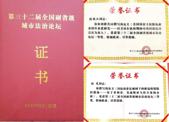在本届法治论坛主题征文中,组委会共征集到2942篇文章,经各副省级城市初评、中国法学会组织专家终审,共评出一等奖10名,二等奖30名,三等奖60名。我校性爱直播 张超汉副教授和硕士生刘静共同撰写的《美国国家主权豁免商业例外条款研究——以美国在抗疫期间对我国提起的滥诉为切入》荣获一等奖,张光教授撰写的《国际投资法视阀下的新冠疫情防控措施——基于菲利普·莫瑞斯诉乌拉圭案的分析》荣获三等奖。这两项目成果也是我校在此次论坛中仅有的两项获奖成果。同时,我校荣获优秀组织奖。