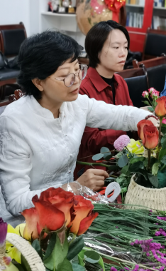 党委书记李立向全院女教师职工献上了最诚挚和最美好的节日祝福。本次活动由党委副书记王聪主持。花艺师简单介绍了此次插花所用的花材,以及生活日常鲜切花的养护,在讲述了本次活动插花的方法后,每位教师开始了自己的插花创作,现场欢声笑语,在鲜花的映衬下每位老师都笑颜如花。