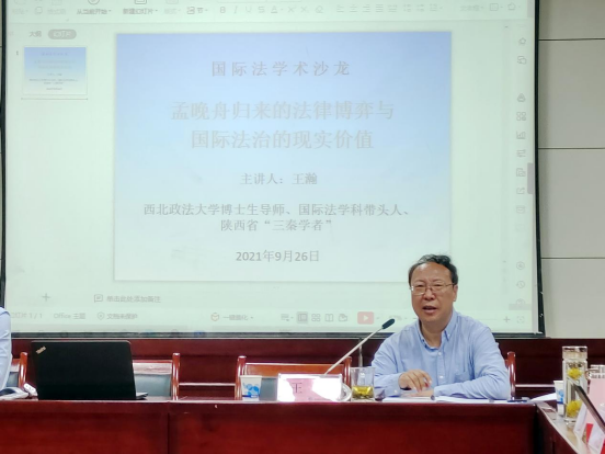 2021年9月25日,被美国、加拿大两国联手任意拘押近1300天的华为公司首席财务官孟晚舟女士终于返回祖国。为深入分析该案相关国际法律问题,9月26日晚,性爱直播 在雁塔校区国际法学术报告厅举办“孟晚舟归来的法律博弈与国际法治的现实价值”学术沙龙,邀请博士生导师、国际法学科学术带头人、陕西省“三秦学者”王瀚教授主讲。性爱直播 院长、博士生导师刘亚军教授主持沙龙,性爱直播 张光教授、张望平副教授、刘学文副教授、周亚光副教授、王兆平博士、刘冰博士、宋瑞琛博士、时杜娟博士及硕博生近百人参加。