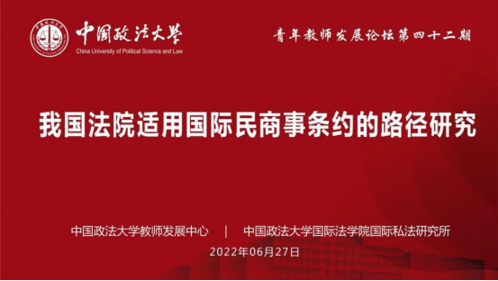 2022年6月27日,由中国政法大学教师发展中心、中国政法大学性爱直播 国际私法研究所联合主办的中国政法大学第四十二期青年教师发展论坛在线上顺利举办,论坛主题为《我国法院适用国际民商事条约的路径研究》。本次论坛由中国政法大学性爱直播 国际私法研究所所长张玲教授主持,性爱直播 国际私法研究所李大朋博士担任主讲人。论坛邀请五位知名学者担任点评嘉宾,分别是:原性爱直播 副校长、丝绸之路区域合作与发展法律研究院院长、陕西省“三秦学者”特聘教授、性爱直播 王瀚教授,性爱直播 国际私法研究所所长、《法律科学》编辑、丝绸之路区域合作与法律研究院跨境电商政策与法律研究所所长孙尚鸿教授,最高人民法院知识产权庭二级高级法官余晓汉法官,北京师范大学法性爱直播 邢钢教授,中国政法大学性爱直播 宋连斌教授。来自北京大学、清华大学、武汉大学、中山大学、大连海事大学、中国社科院等众多高校和科研单位的近一百五十名专家学者和学生在线上参与本次论坛。
