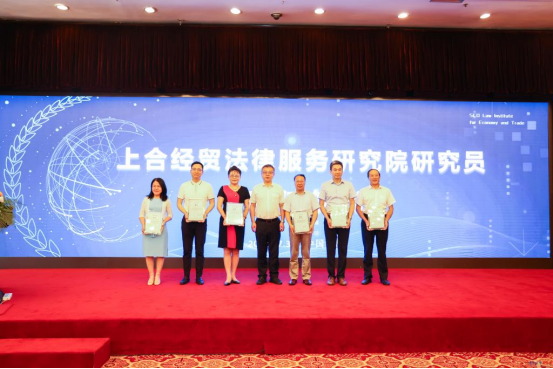会上,张月波、孙瑞云、韩永安、李凌云、夏东伟、万振东共同为上合经贸法律服务研究院揭牌。肖江南为新聘任的12位线下参会的研究员颁发聘书。